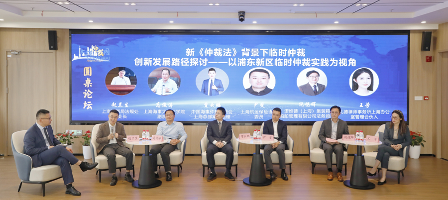 随后的圆桌论坛将全场气氛推向高潮。来自上海海事局、上海海事大学、中国海事仲裁委员会上海总部、上海航运保险协会、律师事务所及企业的6位嘉宾,围绕“新《仲裁法》背景下临时仲裁创新发展路径探讨——以浦东新区临时仲裁实践为视角”这一议题,展开了热烈讨论。嘉宾们从监管、学术、实务、用户等多元视角出发,各抒己见,碰撞思想,为临时仲裁在浦东的创新实践提供了宝贵的思路与建议。